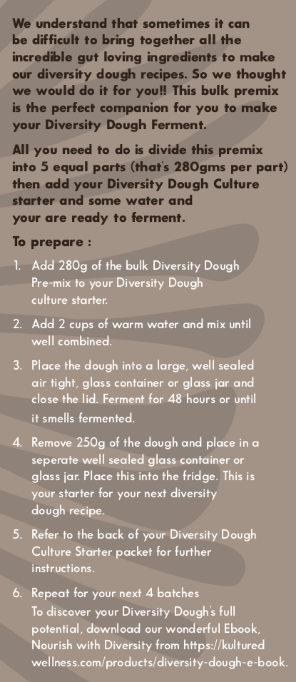 We understand that sometimes it can be difficult to bring together all the incredible Gut loving ingredients to make our diversity dough recipes. So we thought we would do it for you!! This bulk premix is the perfect companion for you to make your Diversity Dough Ferment.